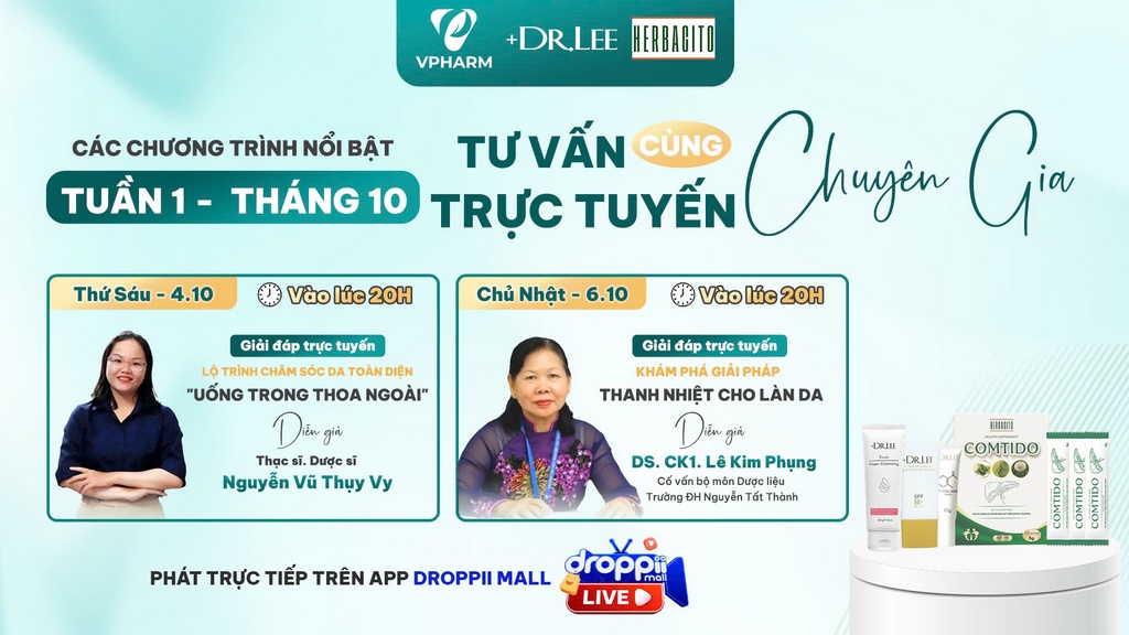 Ds. CK1. Lê Kim Phụng – Cố vấn bộ môn Dược liệu Trường ĐH Nguyễn Tất Thành và chuyên gia chăm sóc da GĐKD Vpharm – Ms. Hà Min sẽ giúp bạn hiểu rõ nguyên nhân khoa học về lý do làn da lại dễ bị mụn, sạm, và kích ứng do nóng trong. Đồng thời, hai chuyên gia còn mang đến những giải pháp làm mát cơ thể tự nhiên, an toàn và hướng dẫn xây dựng một lộ trình chăm sóc da toàn diện. Buổi livestream hứa hẹn mang đến cho bạn những bí kíp thanh nhiệt từ bên trong để giúp làn da không chỉ đẹp mà còn khỏe mạnh và căng tràn sức sống.