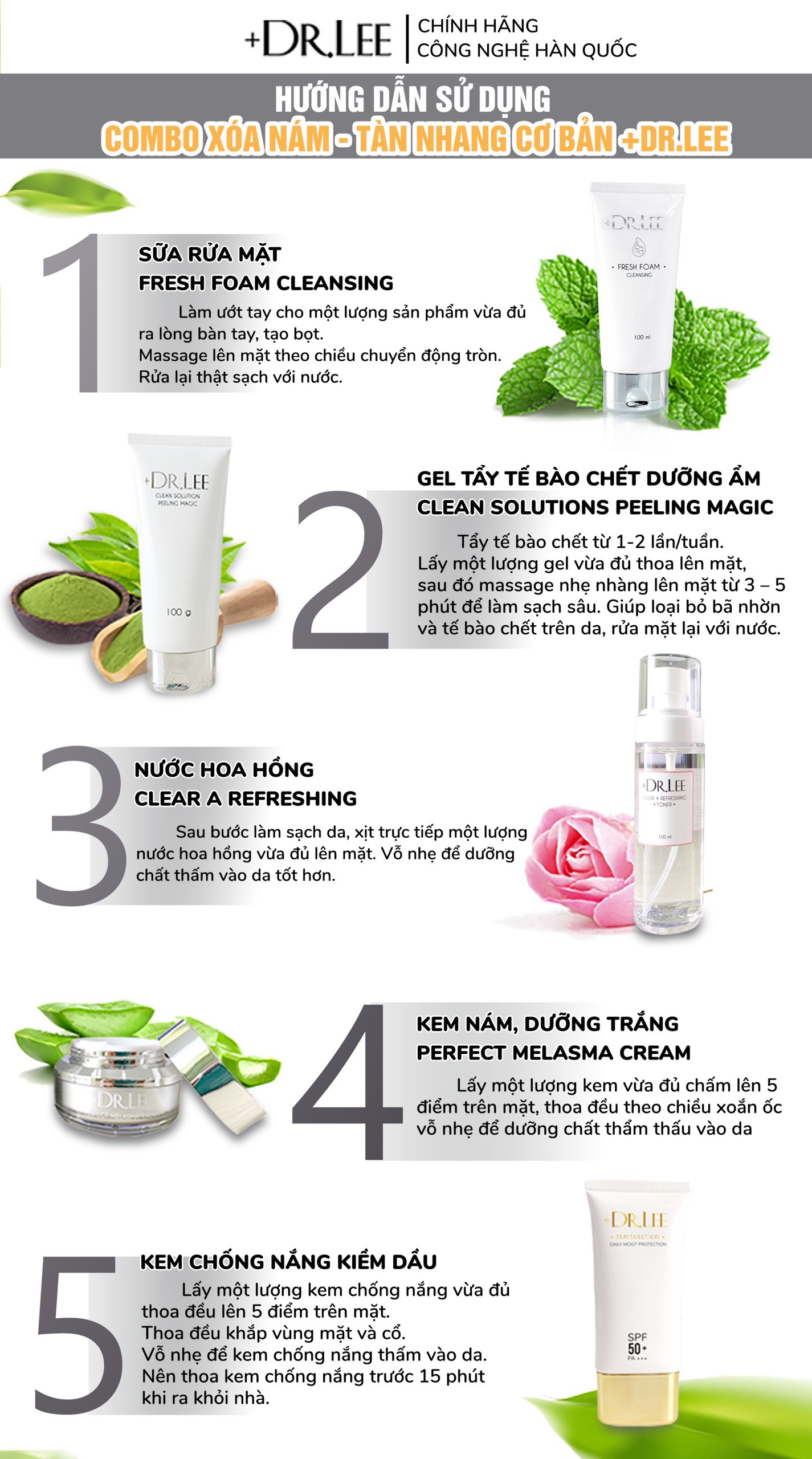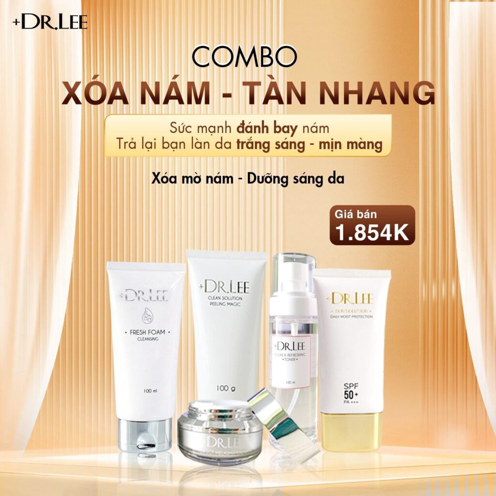 Combo Xóa Nám, Tàn Nhang Cơ Bản +Dr.Lee giúp làn da của bạn trở nên sáng và đều màu hơn. Thực hiện theo combo với những bước chăm sóc làn da toàn diện, giúp làn da của bạn luôn được nuôi dưỡng một cách tốt nhất, những vết nám, tàn nhang trên da sẽ mờ dần và mất hẳn.