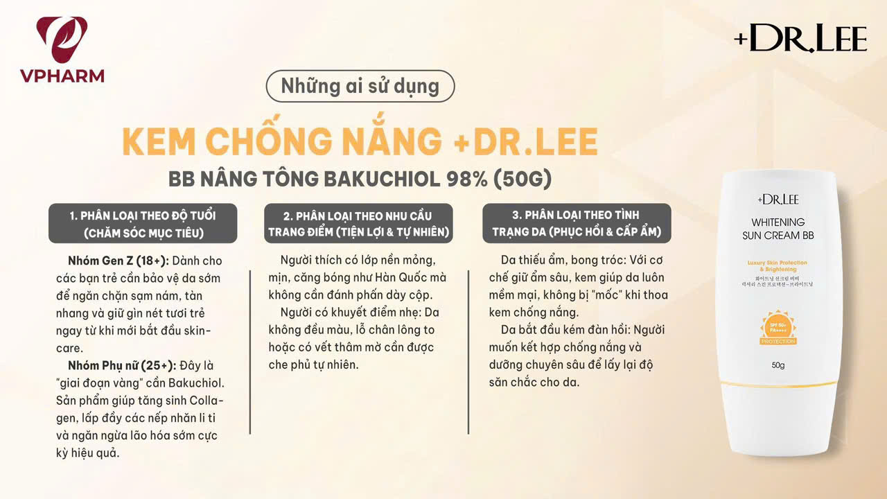 Kem Chống Nắng +Dr.Lee BB Nâng Tone Trắng Sáng SPF50+/PA++++ Bakuchiol 98% phù hợp với loại da nào?